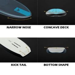 - Step Cap – Sharper edge, better upwind – The Step Cap technology allows for thinner rails which enhance the upwind and tracking abilities of the board.